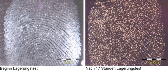 Als Beleg ist im Bild ein korrodiertes Stahlwerkstück gezeigt. Die Korrosionsstellen folgen den Linien von Fingerpapillen. Untersucht man die Korrosionsprodukte im Rasterelektronenmikroskop mittels Mikroanalysensystem (EDX) so findet man am Rand jedes einzelnen korrodierten Flecks in der Hauptsache die Signale für Eisenoxide. In der Mitte jedes einzelnen Flecks findet man ein Körnchen Korrosionsprodukte an deren Unterseite man ein deutliches Chlorsignal im EDX-Spektrum ausmachen kann.